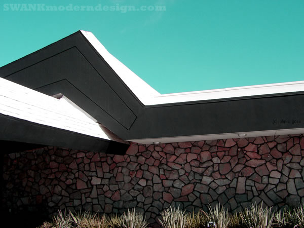 Palm Spring's iconic 1959 City National Bank (currently Bank of America) by Victor Gruen Associates, inspired by Le Corbusier's chapel in Ronchamp, France. Image by American artist John Goss, from his exhibition Desert Mod.