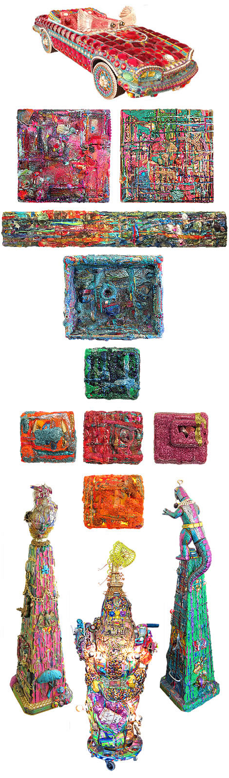 - 48"h, base 12" X 12" square found objects, costume jewels, glitter, glue