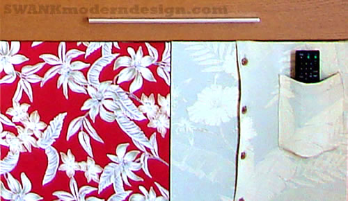 The ultimate in Tiki modern decor! Recycled vintage aloha shirts decorate the doors on this living room essential.