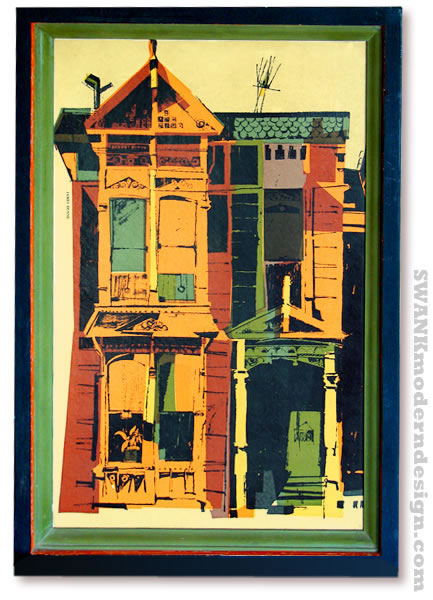 Mr Wavy Gravy's Neighborhood! Straight from the Summer of Love's epicenter, San Francisco's Haight-Ashbury district. The city's Victorian gingerbread rowhouses became havens for the hippies who descended on the scene in 1969. Artist James Dunne rendered this Warholesque treatment of one of the "painted ladies." Matching frame hand-painted in tangerine and avocado!