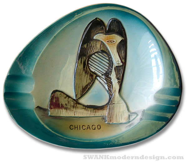 White trash treasure! Commorative souvineer googie ashtray of Chicago's monumental outdoor Picasso (sculpture designed in 1965). Pop mechanical reproduction, modernism, collectable kitch and fine art all collide in this hand-painted Made-in-Japan multiple. Way, way ahead of Murikami-san.
