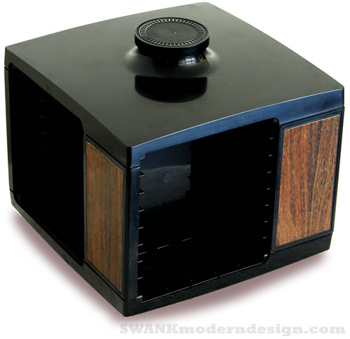 Turn, turn, turn! Another clever display for a now extinct technology. Spin this compact black plastic cassette holder and dig the stylish faux hard wood decals. Remember when stereo speakers were all chunky wood boxes with black screens? Remember auto-reverse? Remember Dolby B?
