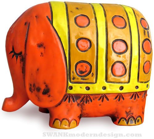 Hatari! This bashful pachyderm in bright, mod hues is perfect to prop up your Henry Mancini LP collection in your 1960s hipster den.