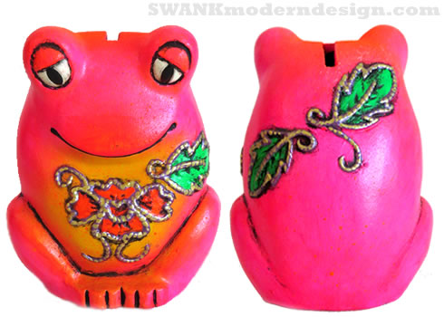 Make love, not warts! Jeremia is a bullfrog, hand-painted in far-out day-glo colors with gold accents. Vintage 1960s coin bank will fit perfectly in your trippy lily pad.
