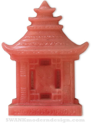 Once upon a dime! Remember those mid-century coin-operated souvenir machines? You'd put your dime in and two shiny mold halves would come together, hot plastic would be injected through transparent tubes as you watched and, as the molds separated, a spatula would scoop your still-warm memento into the retrieval compartment. This salmon pink pagoda is from the famous foyer of Sid Grauman's Chinese Theater on Hollywood Boulevard where stars imprinted their shoes, hands and signatures in wet cement. It says "Chinese Theatre" on one side and "Hollywood, CA" on the other. In the center is depicted the famous hand and footprints - one side even shows the imprint of Roy Roger's gun and Trigger's horse shoe!