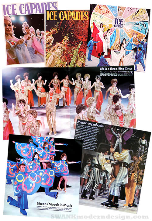 Grooviness on Ice! Ephemeral time capsules of American camp culture. Spandex mid-air splits, sequined top hatted rotating chorus lines, blobby amoeba psychedelic light projections, split-screen multi-media happenings - all on frozen water! Johnny Weir wasn't even born yet and America was already getting an annual dose of rhinestone ice queens. Here's the proof in glorious technicolor and synthetic strech fabrics.