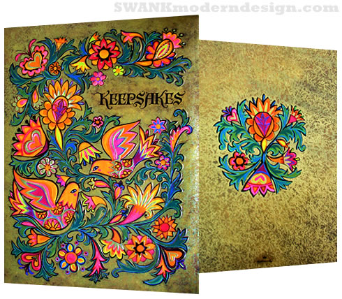 Get yourselves back to the garden! Organize your trippy memories with this stunningly groovy 60s keepsake organizer with a blazing, psychedelic tooled cover in day-glo on antiqued gold. Inscribed inside, "To Mother, From Pauline, August 6, 1968," back when Hallmark was feelin' groovy. Five compartments with tabs that may be labeled.