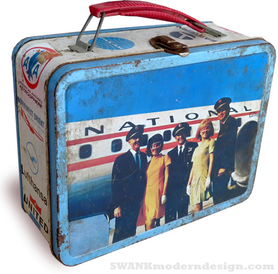 We have reached cruising altitude! Oh, the lucky kid that got to carry this swinging lunch pail to elementary school every day. Just at those fab plastic goggles and white gloves. The perfect display case for your swizzle stick collection, vintage cocktail recipes or mile high club sandwich.