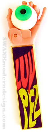 Eat Me! While baby boomers were experimenting with Mellow Yellow and Lucy in the Sky with Diamonds, their younger siblings fed their heads with pure sugar pills supplied by Pez pushers. Luv pez on one side and Mod Pez on the other. This super rare 1968 psychadelic toy for children is coveted by Pez-heads!