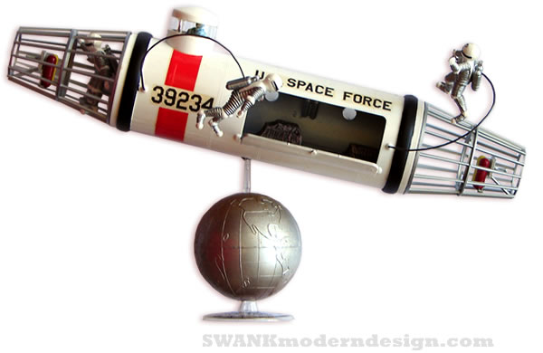 Five, Four, Three, Two, One...Lift-off Willie Ley inspired a generation of Earth-bound space cadets to dream of the bigger universe. This period Monogram "Space Age Hobby Kit" was part Tom Swift and part Major Matt Mason. Assembled and hand-painted using the vintage decals. The "Space Taxi" model is re-positionable on a silver and bronzed globe stand. Interior storage bay filled with cargo, three suited astronauts and one commander in the cockpit.