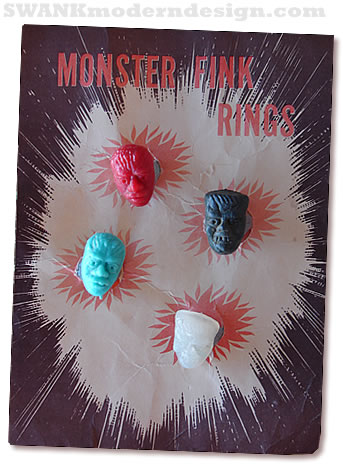 Give 'em the finkger! Four vintage plastic children's rings - in blood red, corpse turquoise, charcoal grey and translucent bone - on a supergraphic display card. Kill two 1960s fads (monsters and finks) with one stone cold groovy accessory.