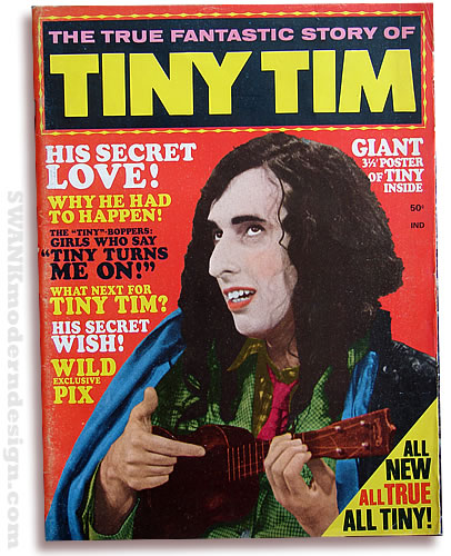 American idol! 1968 magazine tribute to Lebanese-Polish American music historian, Herberto Buckinham Khaury, aka Tiny Tim. A true icon of the pop 60s, often appearing on Laugh-In and The Tonight Show. Filled with fun facts and trivia, such as a typical Tiny Tim breakfast (one raw onion, grape and prune juice, 1/2 pound of peanuts, mangoes and three bananas) and his showering routine. Tributes from Joni Mitchell, Sally Field, Cher, Mama Cass, Nancy Sinatra and Judy Carne. Essential display item for any mid-century magazine rack.