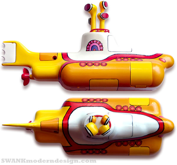 "We all live in a yellow submarine." Based on superlative designs by pop graphic artist, Heintz Edelmann, this is a hand-painted and custom detailed kit model of the yellow submarine that carried The Beatles to Pepperland to vanquish the Blue Meanies. Two cargo compartments with opening doors reveal Old Fred and Jeremy Hilary Boob Ph.D.